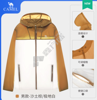 骆驼 男款时尚撞色轻薄遮阳透气连帽皮肤风衣 S 沙土棕/极地白 7C72251001