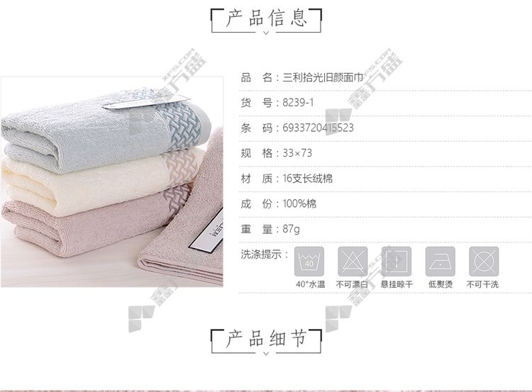 首页 首页 / 三利 8239-1 拾光旧颜面巾 33*73cm 混色 87g 8239-1