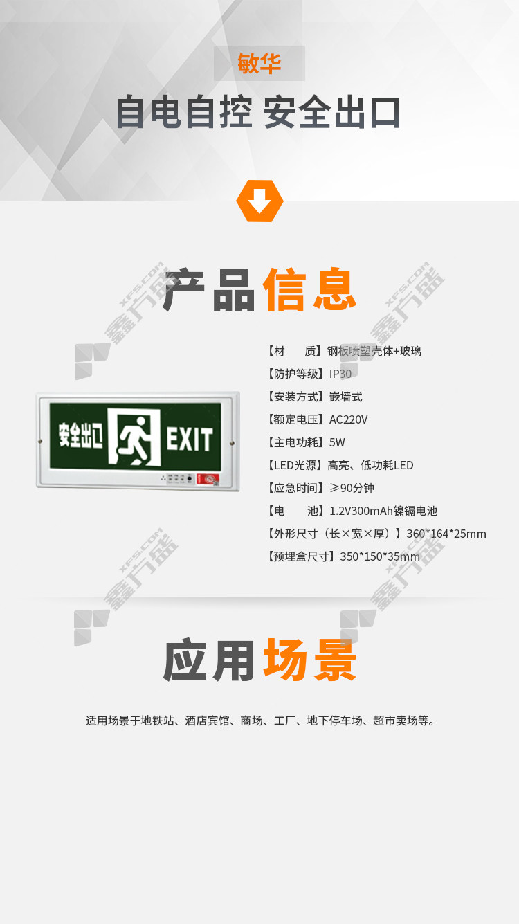 • 敏华 自电自控安全出口 M1412-A 单面向右 5W 220V IP30 嵌墙式