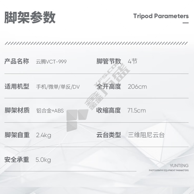 • 云腾  三脚架  型号:VCT-999 规格描述:最大高度2.06米